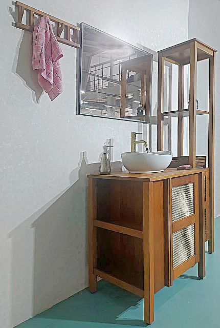 Комплект для ванной Мерлин изготовлен из термоясеня, что обеспечивает долговечность и устойчивость к влаге.